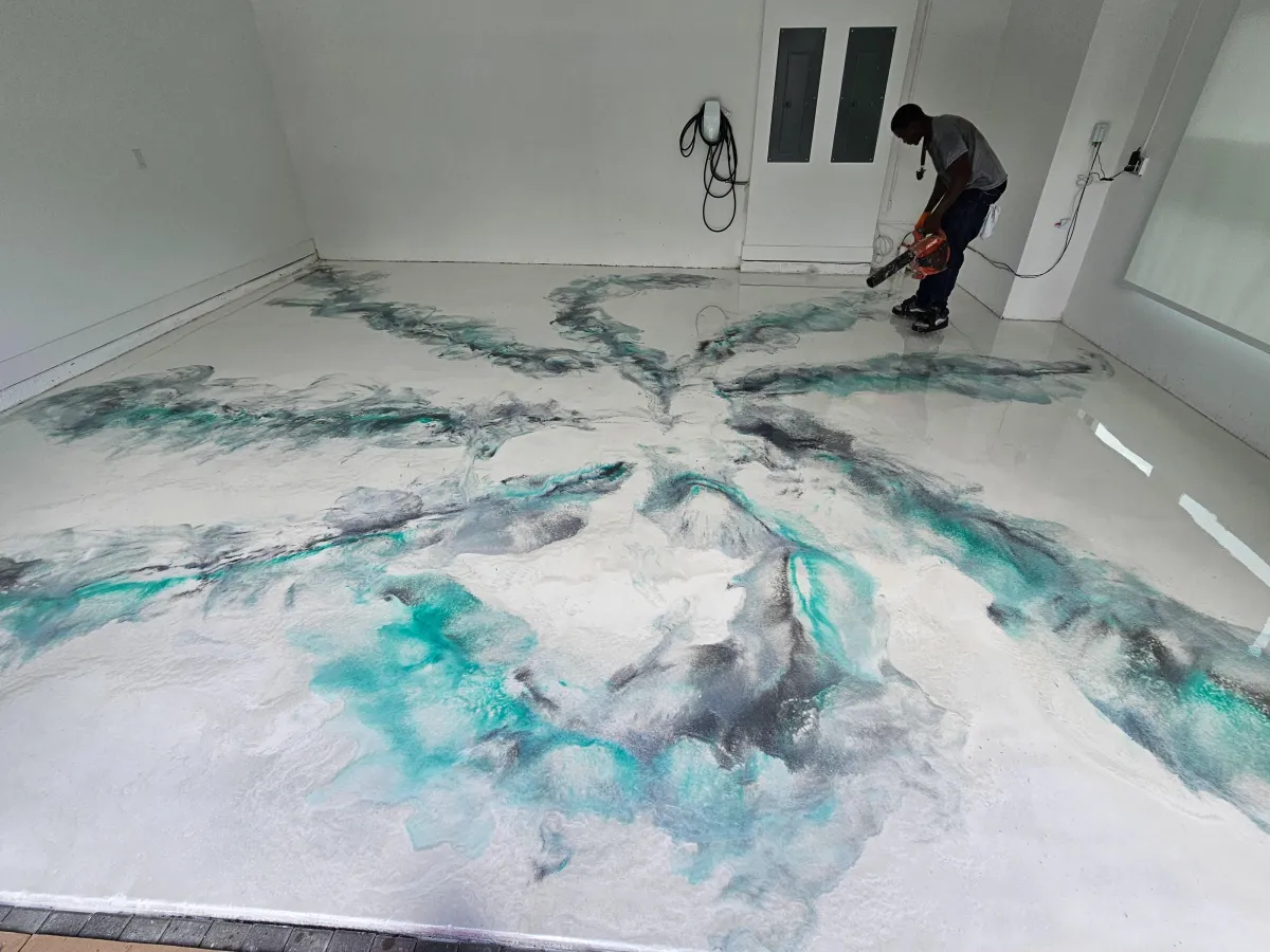 The most decorative and easily customizable 3D floor system on the market. It's a mixture of colored basecoat and metallic powder pigments, applied using different application techniques. These floors are always one-of-a-kind, stain, scratch and chip-resistant. Non-porous, light-reflective and easy to maintain and clean.