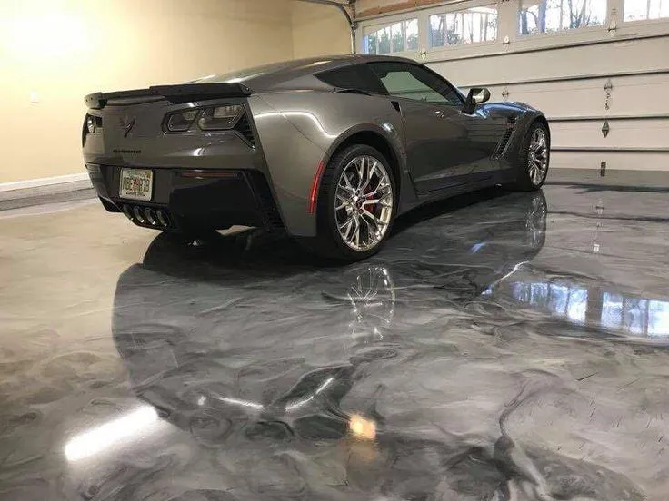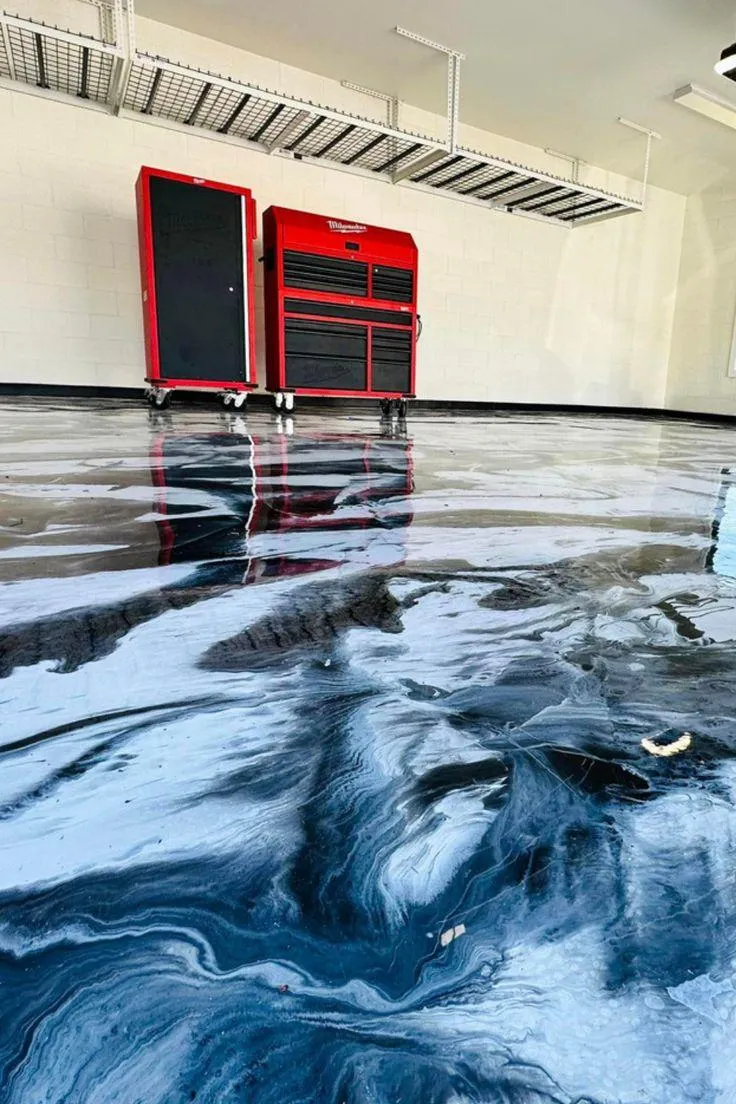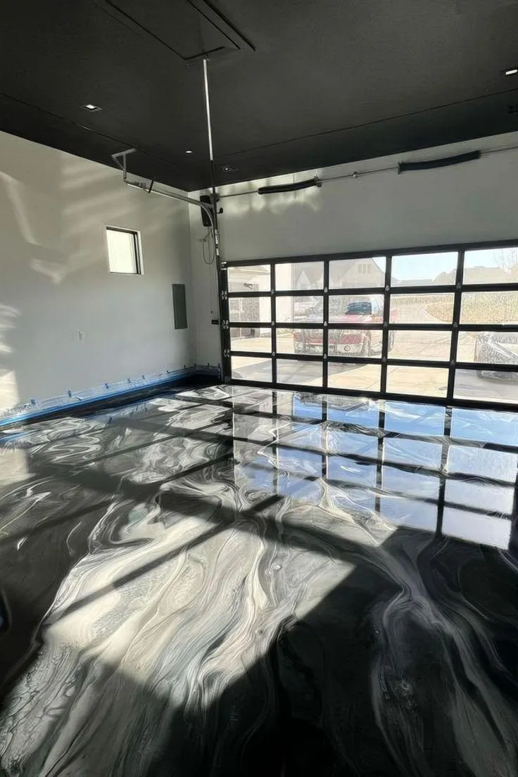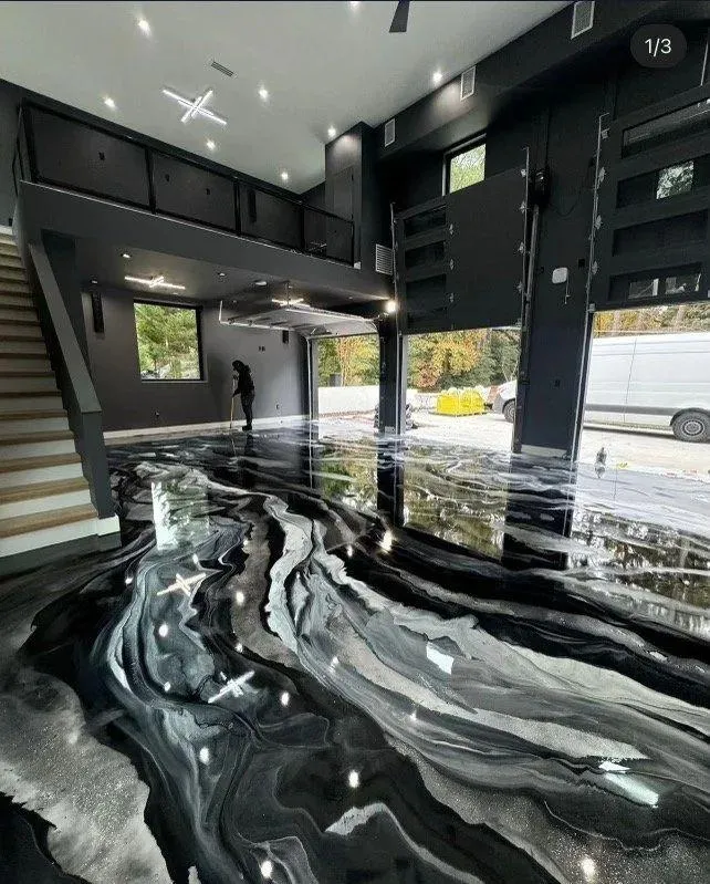 A premium, artistic floor system using metallic pigments suspended in epoxy. Creates a unique 3D effect every time. Durable, stain-resistant, reflective, and easy to clean — perfect for showrooms and luxury spaces.